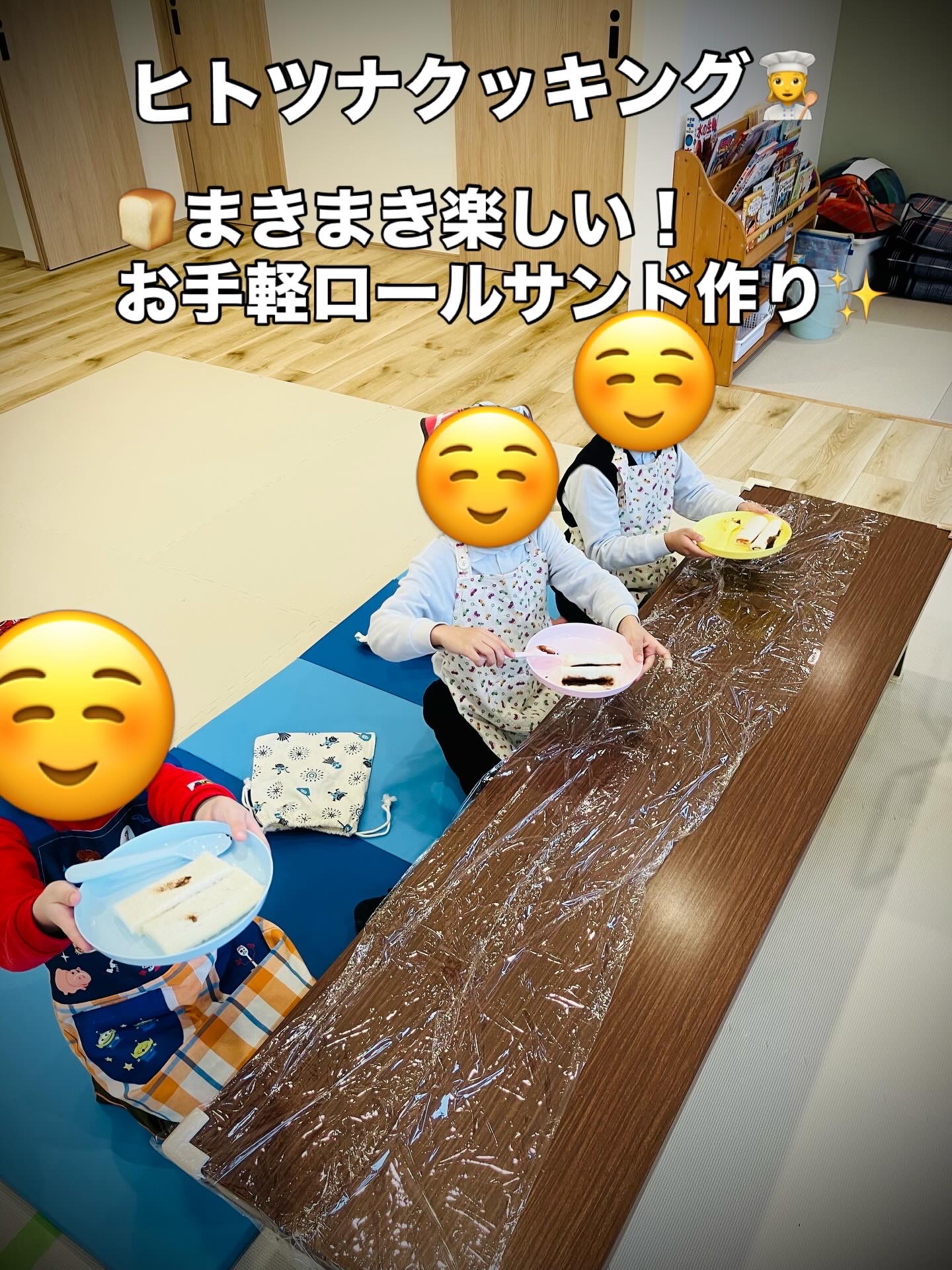 まずは食材クイズで知識を深めてから調理開始!パンにチョコソースやいちごジャムをぬって、丁寧にくるくるまきまき🌀 シンプルだけど、自分で作ったロールサンドの味は格別!「おいしい〜😋もっと食べたい!」とあっという間に完食でした🍀