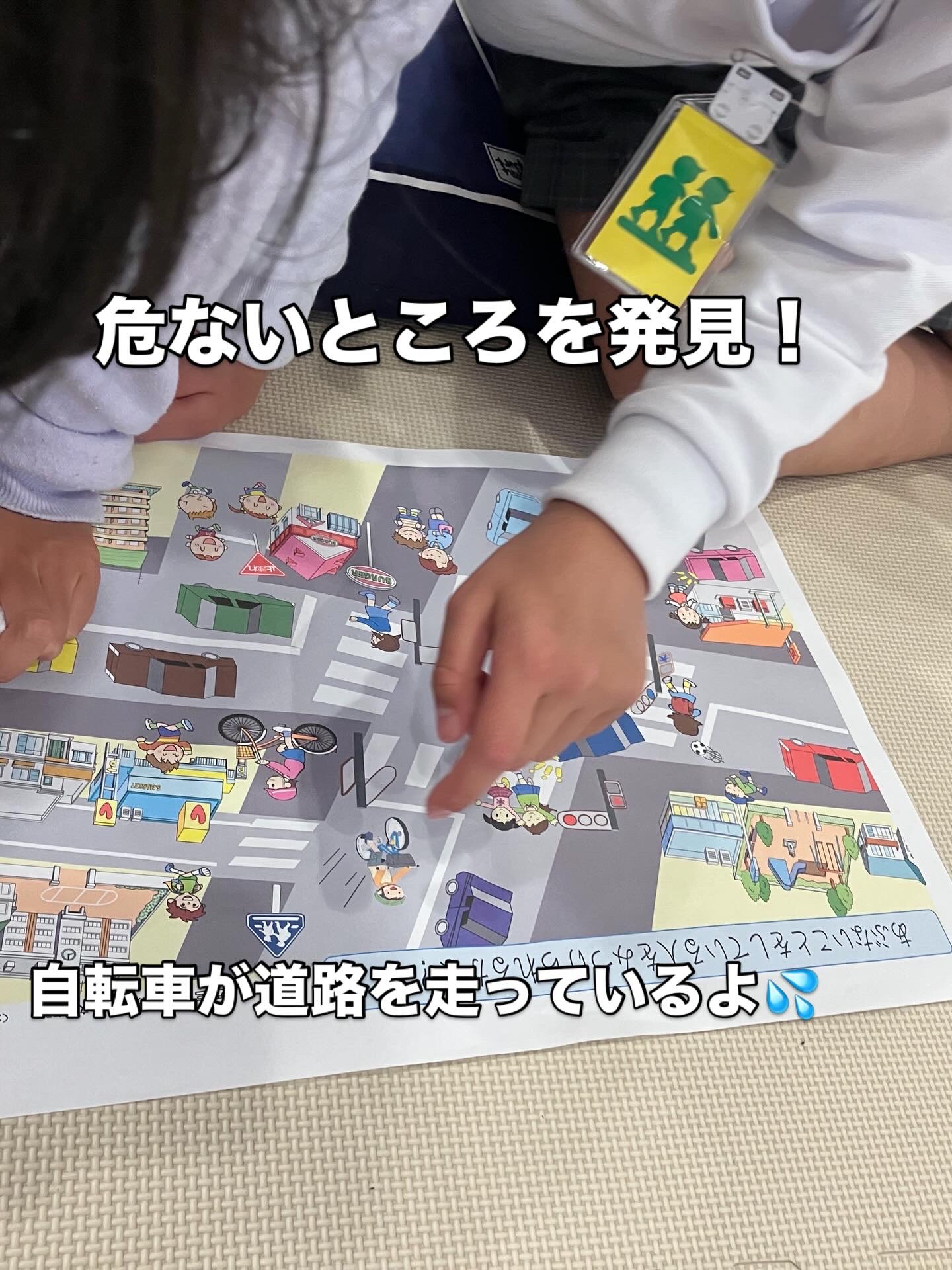次にイラストを見ながら、道路に潜む危険箇所や危ない場面をチェック。「ここは飛び出しちゃダメだね」など、グループのお友達同士で発見したこと、思ったことを確認することができました👍